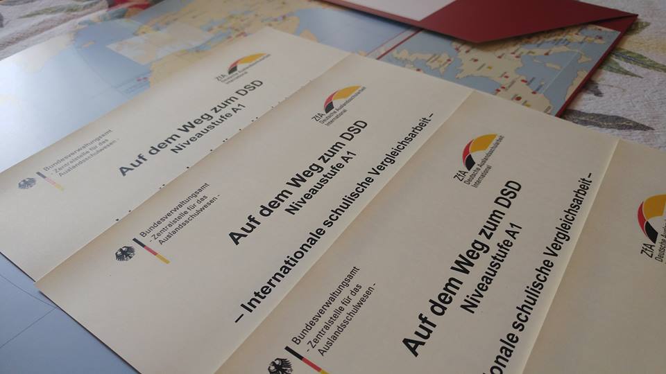 As part of her good-bye visit, Ms. Fehling delivered the A1 certificates for our DaF students, who took the exam this spring. All students passed the exam and can now claim officially that they can participate in simple everyday conversations in German. Congrats to all students and to their teacher, Chris Tabisz.