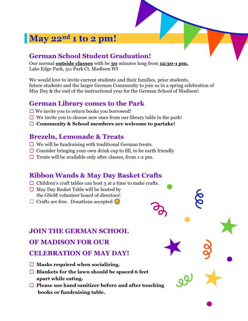 Our school year is coming to an end, and we are happy to celebrate together outside at Lake Edge Park from 1-2 pm on May 22nd. In an effort to bring our library out to our students and community members, we are bringing books from Harry Potter, to toddler story books for borrowing. We would love to invite past, future and current students along with the German Speaking Community to stop by, buy a German pretzel and see the products of our May Day crafts. Willkomen!